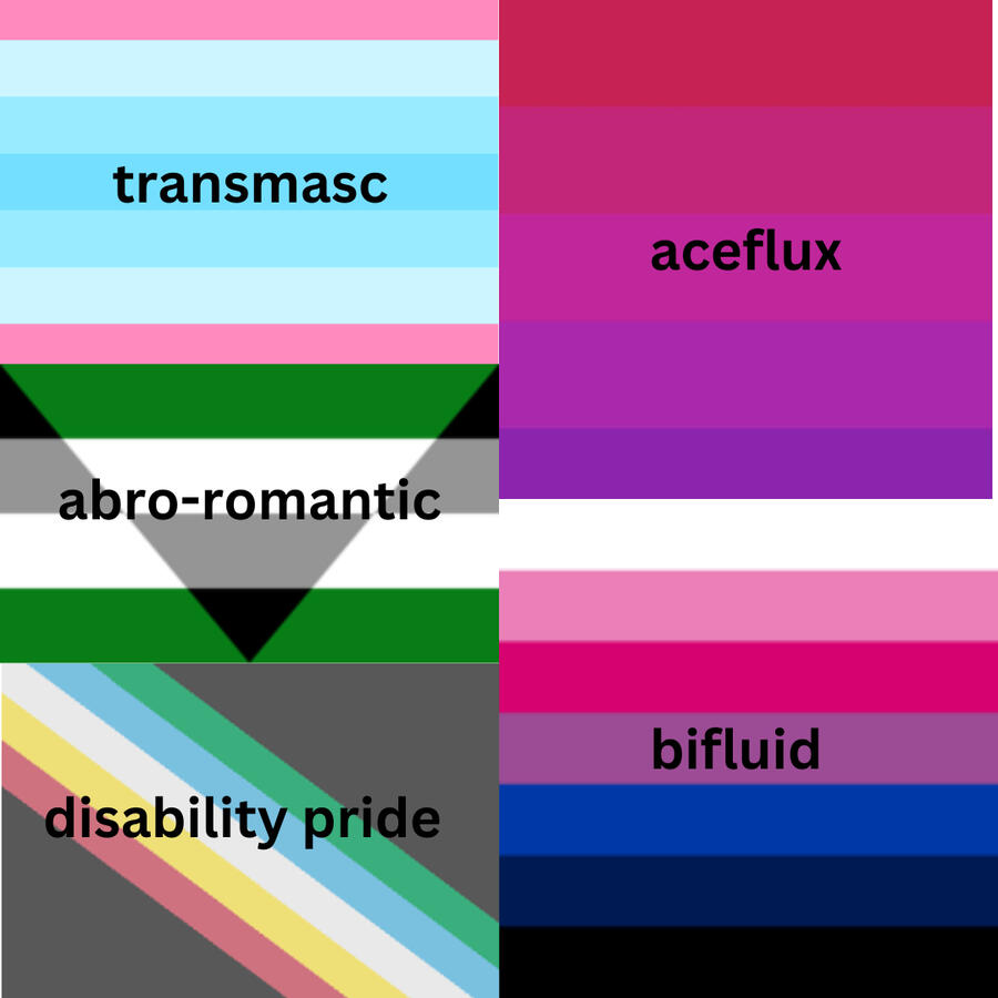 Transmasculine -- Being born as a female but transitioning later in life to be male.Abro-romantic -- finding pleasure in the idea of a romantic relationship but not wanting to be in one.Aceflux -- asexual changing in intensity over time.bifluidsexual -- like genderfluid but bisexual; being attracted to one gender, then the other, sometimes both.Disability pride -- having a disorder or illness that makes it more challenging to navigate, interact with or utilize many everyday situations (examples include visual impairment, autism, motor disorders, and anxiety disorder).